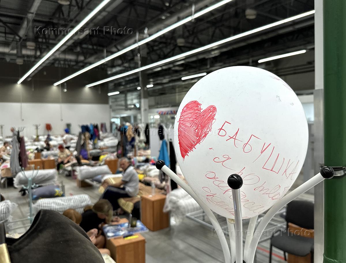 Обстановка в Курске. Пункт временного размещения (ПВР) беженцев, организованный московским ГБУ "Автомобильные дороги". Жанровая фотография.