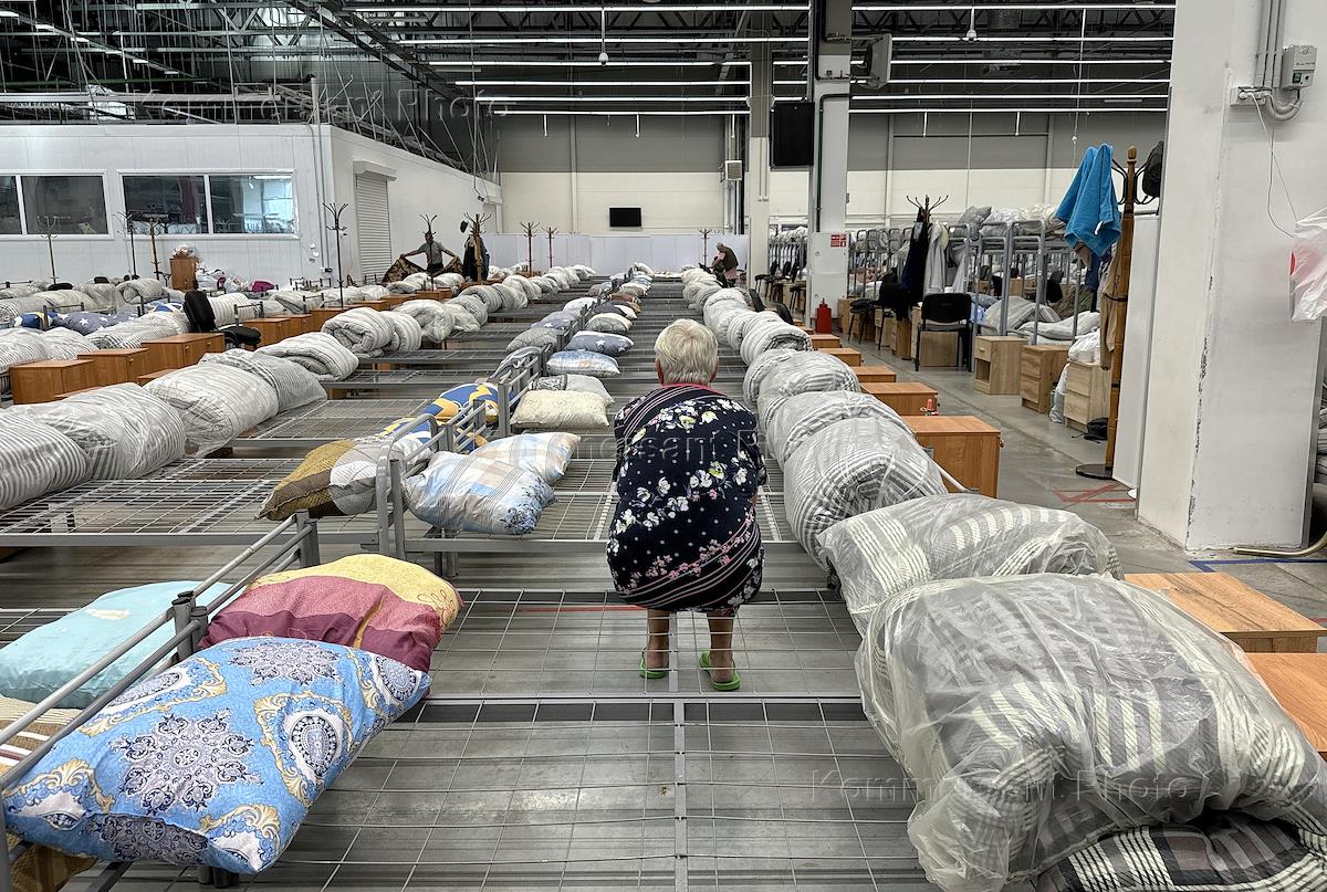 Обстановка в Курске. Пункт временного размещения (ПВР) беженцев, организованный московским ГБУ "Автомобильные дороги". Жанровая фотография.