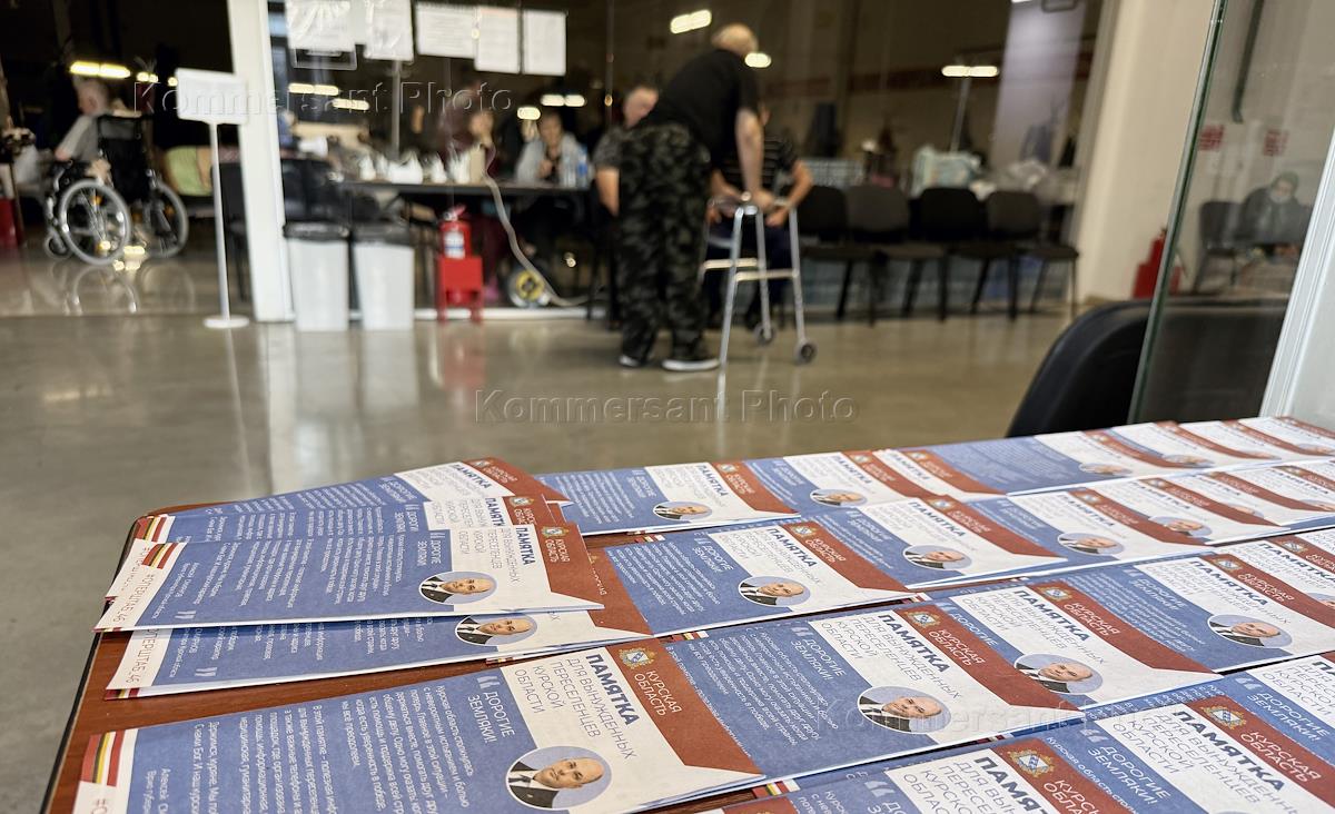 Обстановка в Курске. Пункт временного размещения (ПВР) беженцев, организованный московским ГБУ "Автомобильные дороги". Жанровая фотография. Брошюры - памятка для вынужденных переселенцев Курской области на столе.