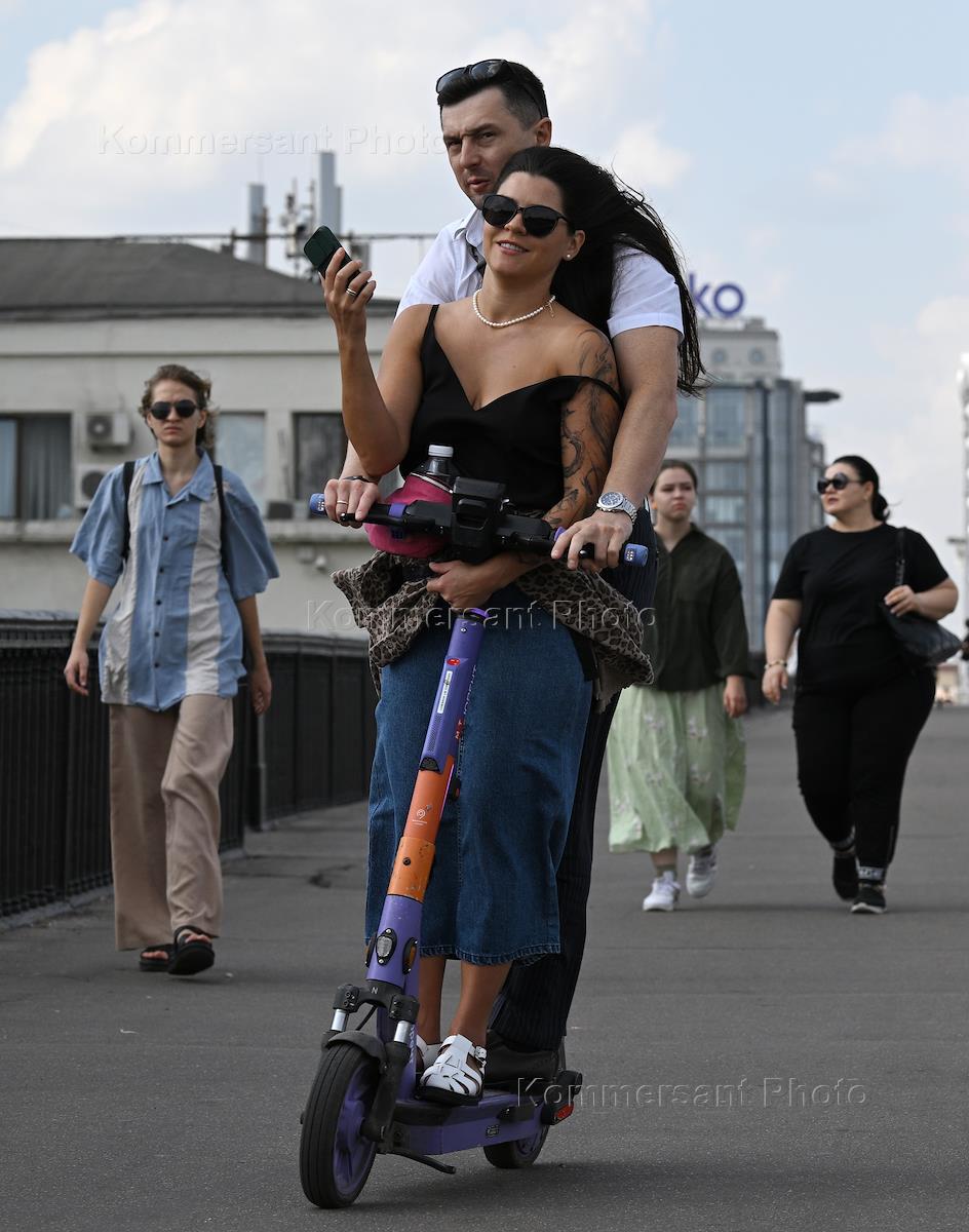Виды Москвы. Жанровая фотография. Двое людей едут на электросамокате.