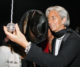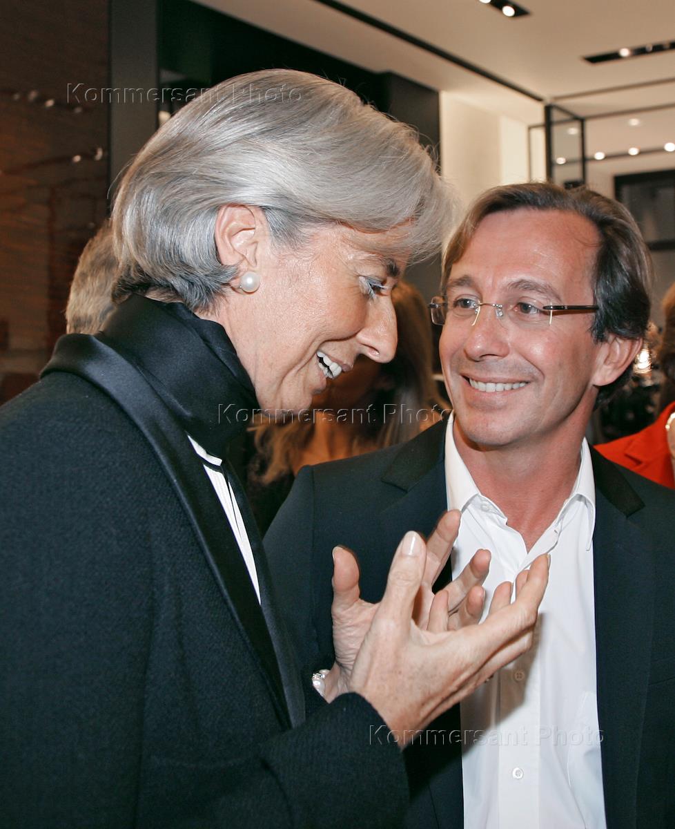 Министр внешней торговли Франции Кристин Лагард (справа) и президент моды Chanel Бруно Павловски (слева) на коктейле, в честь открытия бутика "Шанель" (Chanel) в Столешниковом переулке.