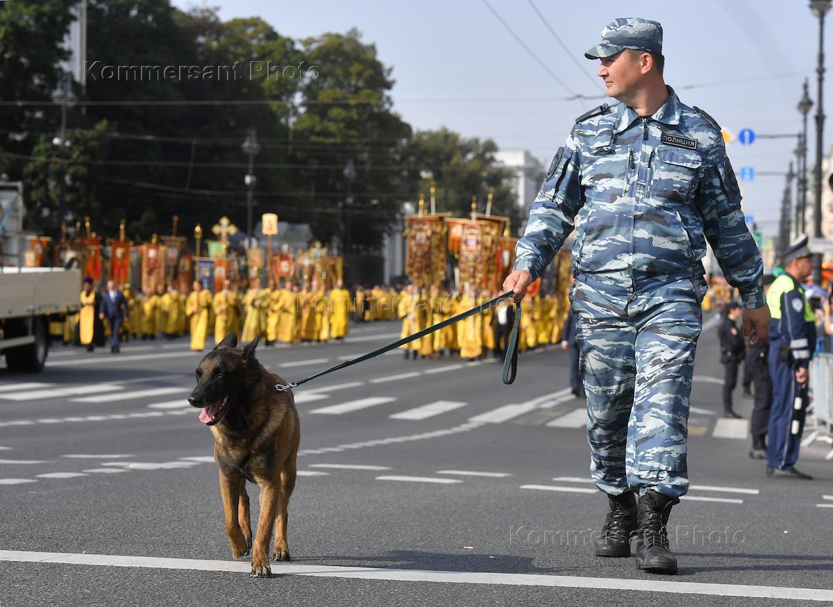 Cross procession on Nevsky Prospekt in honor of the 300th anniversary of the transfer of the relics of the Holy Blessed Prince Alexander Nevsky to St. Petersburg. A law enforcement officer with a service dog while on duty at the Procession of the Cross.