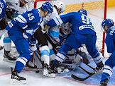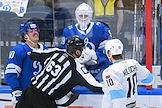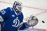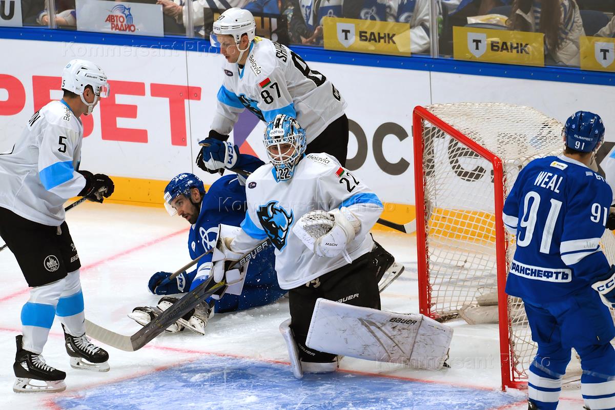 Континентальная хоккейная лига (КХЛ). Чемпионат сезона 2024/25. Матч между командами "Динамо" (Москва) -"Динамо" (Минск) на стадионе "ВТБ Арена". Вратарь команды "Динамо" (Минск) Егор Вельмакин (в центре) во время матча.