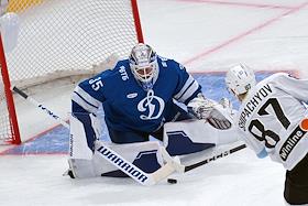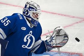 Континентальная хоккейная лига (КХЛ). Чемпионат сезона 2024/25. Матч между командами "Динамо" (Москва) -"Динамо" (Минск) на стадионе "ВТБ Арена". Вратарь команды "Динамо" Хантер Миска во время матча.