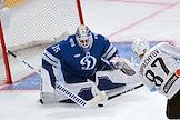 Континентальная хоккейная лига (КХЛ). Чемпионат сезона 2024/25. Матч между командами "Динамо" (Москва) -"Динамо" (Минск) на стадионе "ВТБ Арена". Вратарь команды "Динамо" Хантер Миска (справа) во время матча.