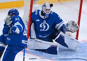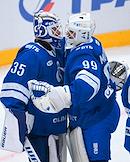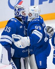 Континентальная хоккейная лига (КХЛ). Чемпионат сезона 2024/25. Матч между командами "Динамо" (Москва) -"Динамо" (Минск) на стадионе "ВТБ Арена". Вратари команды "Динамо" Хантер Миска (слева) и Максим Моторыгин (справа) во время матча.