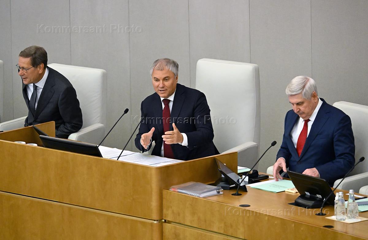 Пленарное заседание Государственной думы (ГД) России. Слева направо: председатель ГД России Вячеслав Володин, первый заместитель председателя комитета ГД России по труду, социальной политике и делам ветеранов Николай Коломейцев и первый заместитель председателя ГД России Иван Мельников во время заседания.