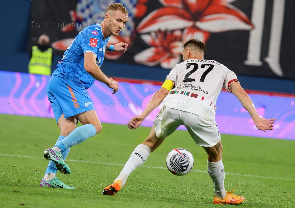 Фонбет - Кубок России по футболу 2024/25. Матч между командами "Зенит" (Санкт-Петербург) - "Рубин" (Казань) на стадионе "Газпром Арена". Игрок команды "Рубин" Даниил Кузнецов (справа) во время матча.
