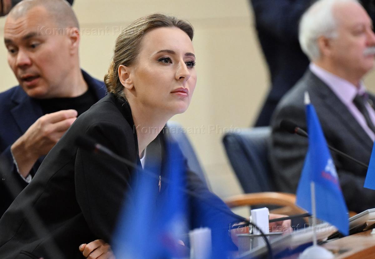 Первое заседание Московской городской Думы (Мосгордума) восьмого созыва. Депутат Мосгордумы Мария Киселева (в центре) во время заседания.