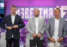Пресс-конференция Российского союза туриндустрии (РСТ) "Завершение летнего туристического сезона: итоги и прогнозы на осень" в пресс-центре МИЦ "Известия". Слева направо: вице-президент РСТ, руководитель комитета РСТ по приключенческому туризму Вадим Мамонтов, вице-президент РСТ, руководитель комиссии РСТ по авиаперевозкам Дмитрий Горин и президент РСТ Илья Уманский во время пресс-конференции.