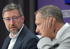 Пресс-конференция Российского союза туриндустрии (РСТ) "Завершение летнего туристического сезона: итоги и прогнозы на осень" в пресс-центре МИЦ "Известия". Вице-президент РСТ, руководитель комитета РСТ по приключенческому туризму Вадим Мамонтов (слева) и президент РСТ Илья Уманский (справа) во время пресс-конференции.