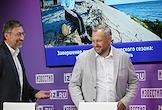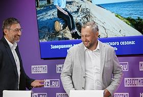 Пресс-конференция Российского союза туриндустрии (РСТ) "Завершение летнего туристического сезона: итоги и прогнозы на осень" в пресс-центре МИЦ "Известия". Вице-президент РСТ, руководитель комитета РСТ по приключенческому туризму Вадим Мамонтов (слева) и президент РСТ Илья Уманский (справа) после пресс-конференции.
