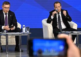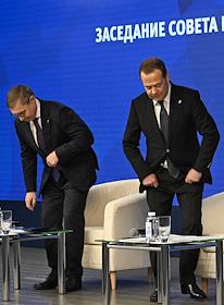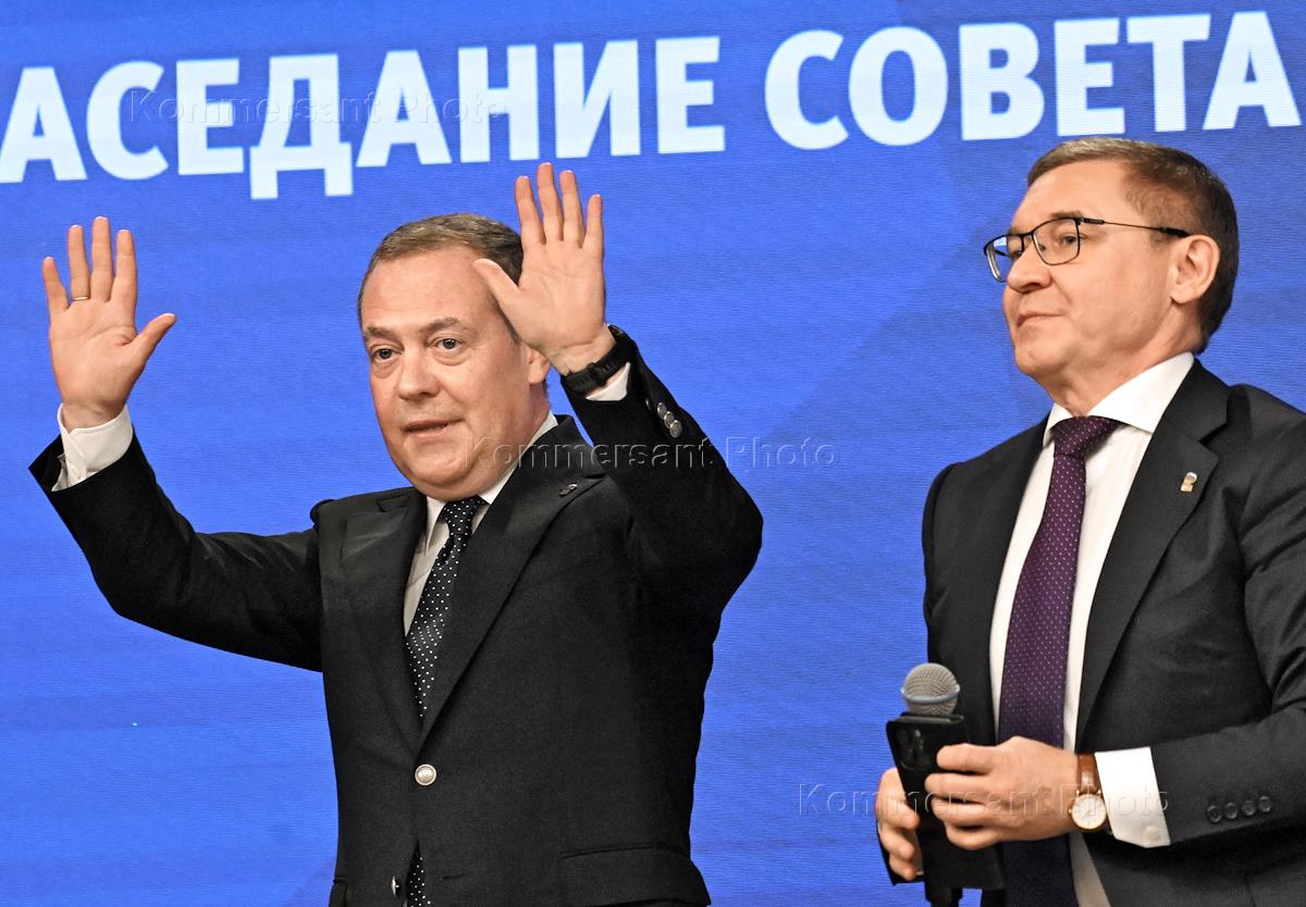 Пленарное заседание Совета первичных отделений партии "Единая Россия" в Центральном исполкоме партии. Председатель партии "Единая Россия", заместитель председателя Совета безопасности России Дмитрий Медведев (слева) и временно исполняющий обязанности секретаря Генерального совета партии "Единая Россия", полномочный представитель президента России в Уральском федеральном округе Владимир Якушев (справа) во время заседания.