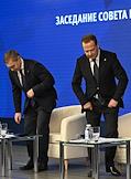 Пленарное заседание Совета первичных отделений партии "Единая Россия" в Центральном исполкоме партии. Председатель партии "Единая Россия", заместитель председателя Совета безопасности России Дмитрий Медведев (справа) и временно исполняющий обязанности секретаря Генерального совета партии "Единая Россия", полномочный представитель президента России в Уральском федеральном округе Владимир Якушев (слева) во время заседания.