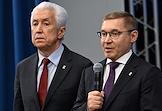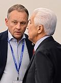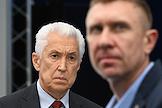 Пленарное заседание Совета первичных отделений партии "Единая Россия" в Центральном исполкоме партии. Временно исполняющий обязанности секретаря Генерального совета партии "Единая Россия", полномочный представитель президента России в Уральском федеральном округе Владимир Якушев (справа) и руководитель фракции "Единая Россия" в Государственной думе России Владимир Васильев (слева) во время заседания.