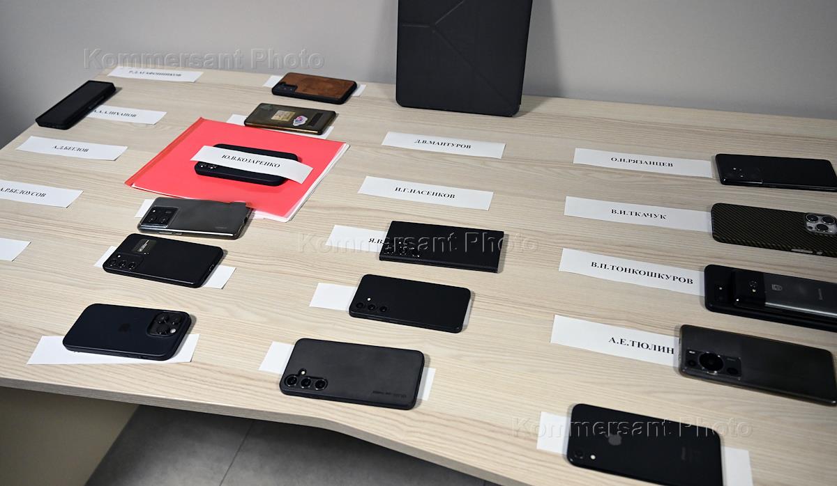 Рабочая поездка президента России Владимира Путина в Санкт-Петербург. Заседание Военно-промышленной комиссии по вопросу развития БПЛА специального назначения. Жанровая фотография. Мобильные телефоны участников заседания.