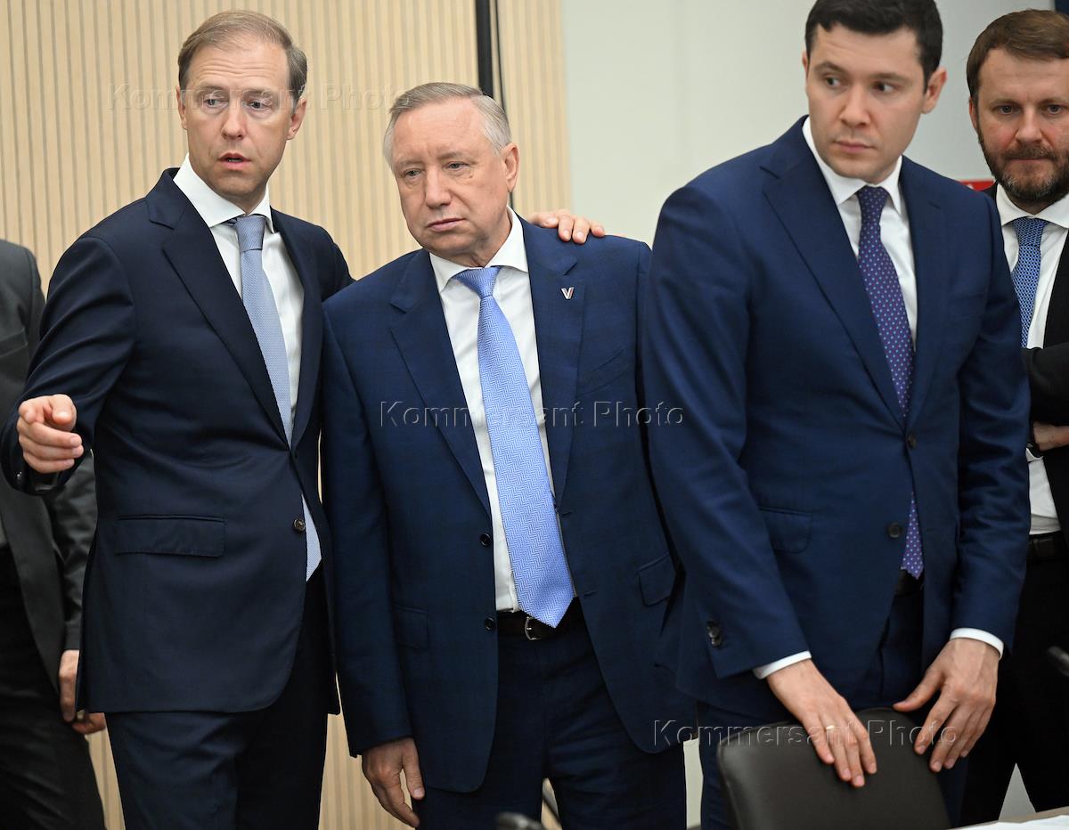 Рабочая поездка президента России Владимира Путина в Санкт-Петербург. Заседание Военно-промышленной комиссии по вопросу развития БПЛА специального назначения. Слева направо: первый заместитель председателя правительства России Денис Мантуров, губернатор Санкт-Петербурга Александр Беглов и министр промышленности и торговли России Антон Алиханов перед началом заседания.