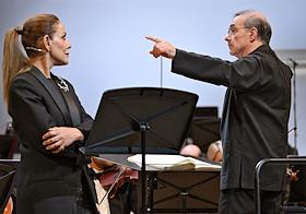 Фестиваль Российского национального оркестра (РНО). Заключительный концерт в концертном зале имени П.И.Чайковского. Телеведущая Сати Спивакова (слева) и дирижер Александр Рудин (справа) во время концерта.