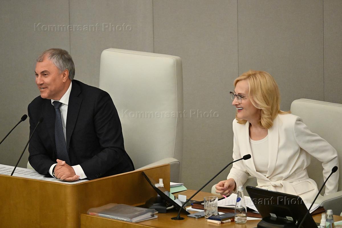 Пленарное заседание Государственной думы (ГД) России. Председатель ГД России Вячеслав Володин (слева) и заместитель председателя ГД России Ирина Яровая (справа) во время заседания.