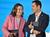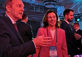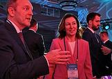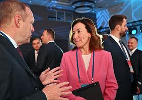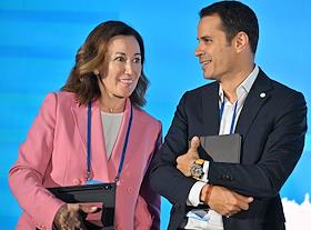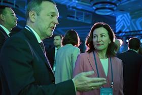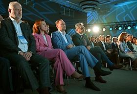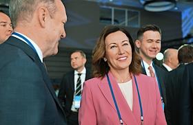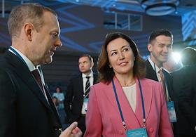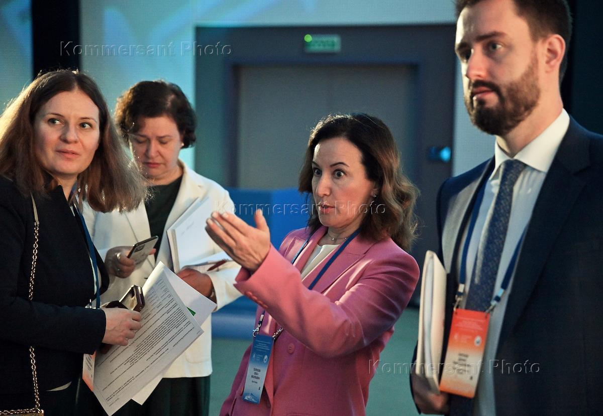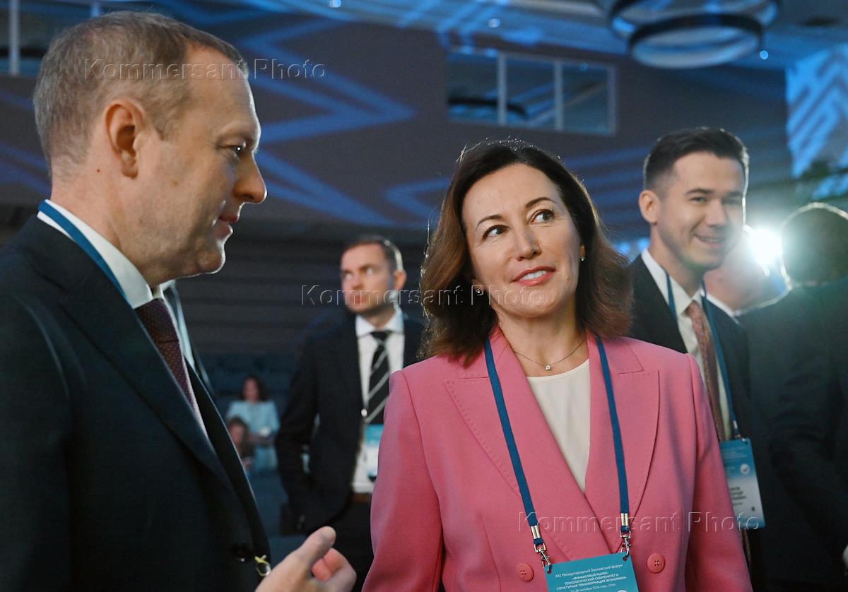 XXI Международный банковский форум в конференц-центре отеля "Pullman Сочи Центр". Первый заместитель председателя комитета Государственной думы России по финансовому рынку Константин Бахарев (слева) и заместитель председателя Центрального Банка России Ольга Полякова (в центре) на форуме.