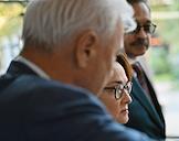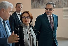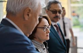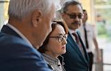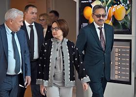 XXI Международный банковский форум в конференц-центре отеля "Pullman Сочи Центр". Сессия "Российская экономика в меняющемся мире". Председатель комитета Государственной думы России по финансовому рынку Анатолий Аксаков (слева), председатель Центрального Банка России Эльвира Набиуллина (в центре) и вице-президент Ассоциации банков России Анатолий Козлачков (справа) перед началом сессии.