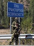 Военные учения по борьбе с диверсионными группами. Тренировка по патрулированию территории. Дорожный знак с надписью "Зона транспортной безопасности".