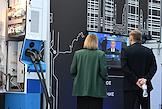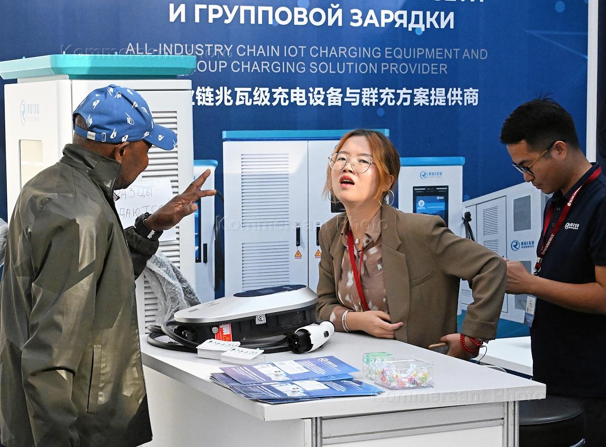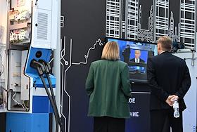 VII международный форум "Российская энергетическая неделя" в ЦВЗ "Манеж". Выставка в рамках форума. Посетители на выставке. Стенд электротранспорта.