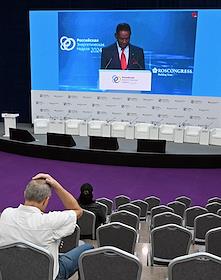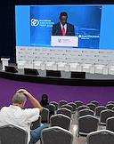 VII международный форум "Российская энергетическая неделя" в ЦВЗ "Манеж". Жанровая фотография. Трансляция выступления президента Экваториальной Гвинеи Теодоро Обианг Нгема Мбасого на пленарном заседании форума.