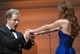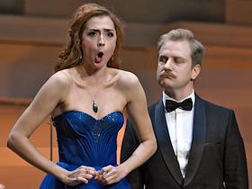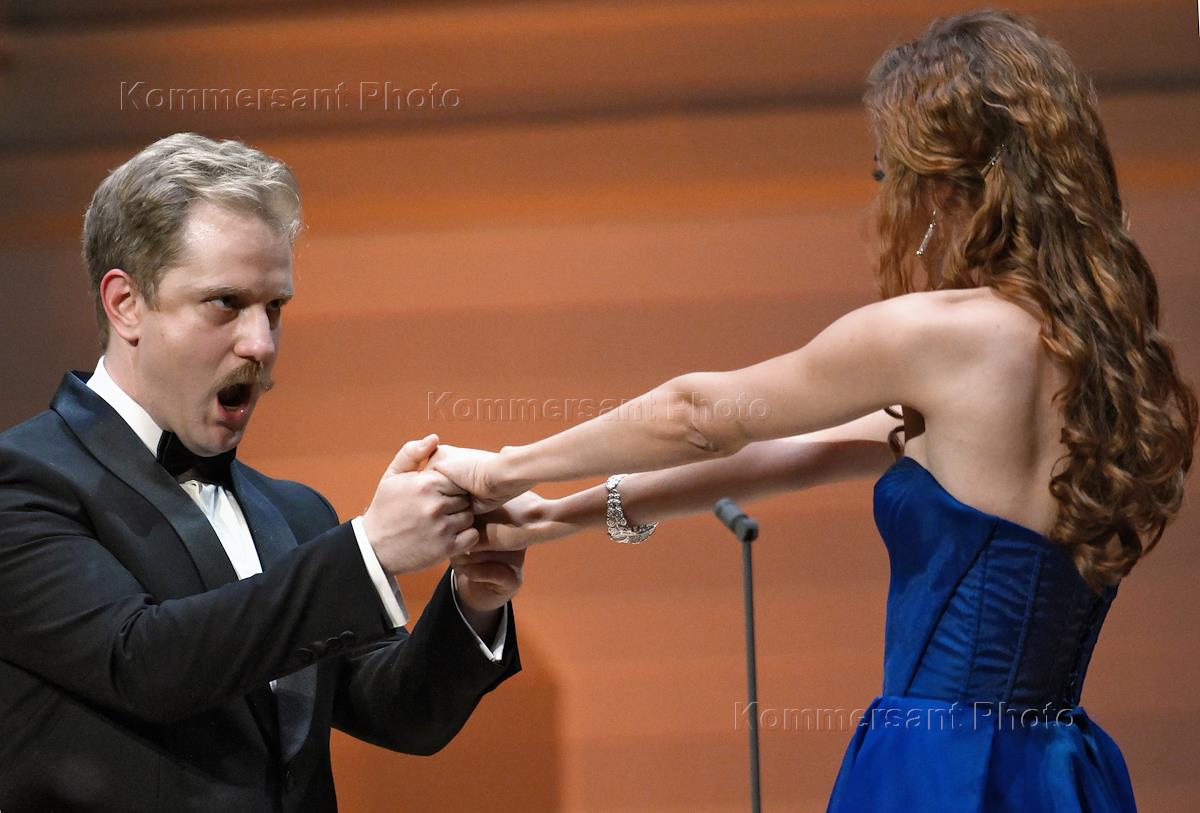 Концерт "Так поступают все женщины" на музыку композитора композитора Вольфганга Амадея Моцарта в исполнении оркестра La voce strumentale и хора Нижегородского государственного академического театра оперы и балета имени А. С. Пушкина в концертном зале имени П.И. Чайковского. Оперные певцы Яна Дьякова (слева) и Константин Сучков во время концерта.