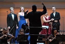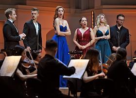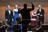 Концерт "Так поступают все женщины" на музыку композитора композитора Вольфганга Амадея Моцарта в исполнении оркестра La voce strumentale и хора Нижегородского государственного академического театра оперы и балета имени А. С. Пушкина в концертном зале имени П.И. Чайковского. Слева направо: оперные певцы Борис Степанов, Яна Дьякова, Надежда Павлова и Константин Сучков во время концерта.