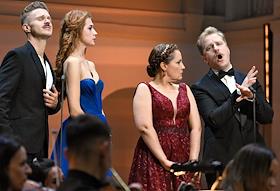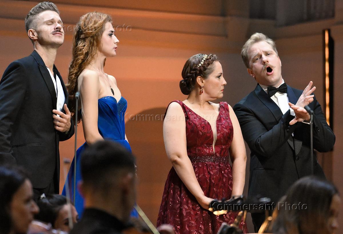 Концерт "Так поступают все женщины" на музыку композитора композитора Вольфганга Амадея Моцарта в исполнении оркестра La voce strumentale и хора Нижегородского государственного академического театра оперы и балета имени А. С. Пушкина в концертном зале имени П.И. Чайковского. Слева направо: оперные певцы Борис Степанов, Яна Дьякова, Надежда Павлова и Константин Сучков во время концерта.