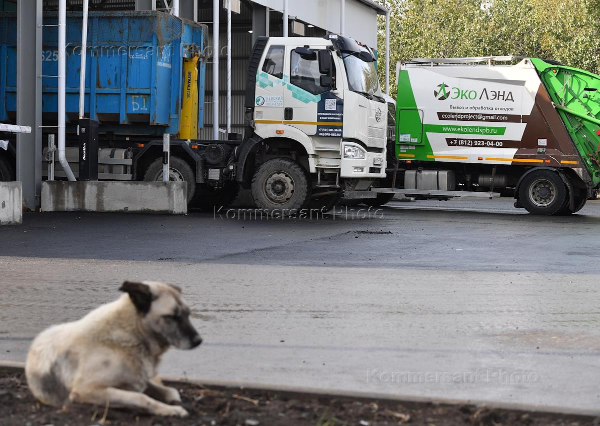 АО "Невский экологический оператор" (НЭО) комплекс по переработке отходов "Волхонка". Жанровая фотография. Мусоровозы на территории комплекса.