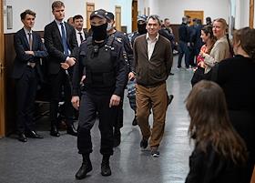 Судебное заседание по делу сопредседателя движения "Голос" (включено Минюстом России в реестр иностранных агентов) Григорию Мельконьянцу, обвиняемого по делу об организации работы нежелательной неправительственной организации, в Басманном районном суде. Сопредседатель движения в защиту прав избирателей "Голос" Григорий Мельконьянц (в центре) во время заседания суда.