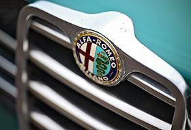 III этап Кубка Москвы по историческому ралли прошел на ВДНХ от вертолетной площадки до Музея Гаража особого назначения. Жанровая фотография. Эмблема автомобиля Alfa-Romeo.