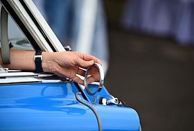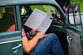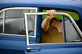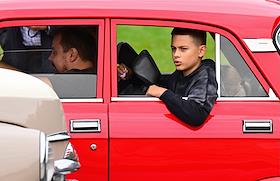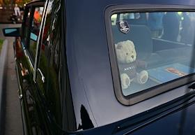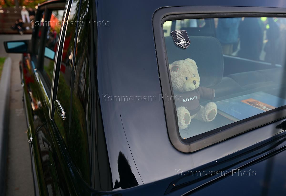 III этап Кубка Москвы по историческому ралли прошел на ВДНХ от вертолетной площадки до Музея Гаража особого назначения. Жанровая фотография. Мягкая игрушка Мишка в салоне автомобиля.