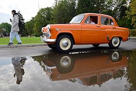 III этап Кубка Москвы по историческому ралли прошел на ВДНХ от вертолетной площадки до Музея Гаража особого назначения. Автомобиль "Москвич 402" во время ралли.