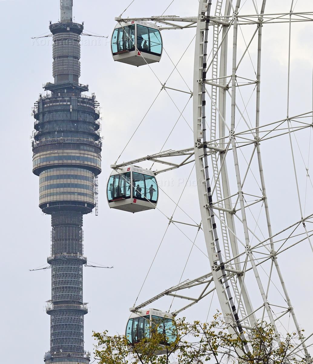 Канатная дорога "Воздушный трамвай" над парком "Орион" на ВДНХ. Жанровая фотография. Вид на Останкинскую телебашню и колесо обозрения "Солнце Москвы" из кабины.