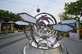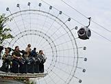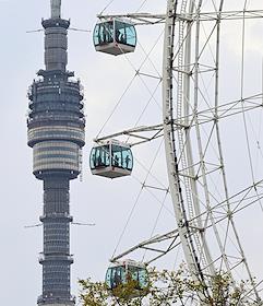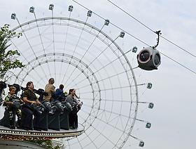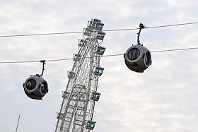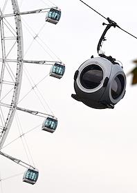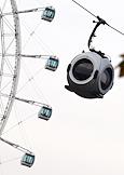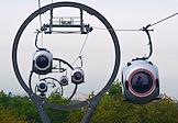 Канатная дорога "Воздушный трамвай" на ВДНХ. Жанровая фотография. Кабины канатной дороги на фоне колеса обозрения "Солнце Москвы".