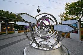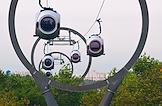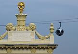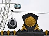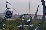 Канатная дорога "Воздушный трамвай" на ВДНХ. Жанровая фотография. Вид на памятник "Покорителям космоса" из кабины.