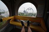 Канатная дорога "Воздушный трамвай" над парком "Орион" на ВДНХ. Жанровая фотография. Вид на Останкинскую телебашню и колесо обозрения "Солнце Москвы" из кабины.