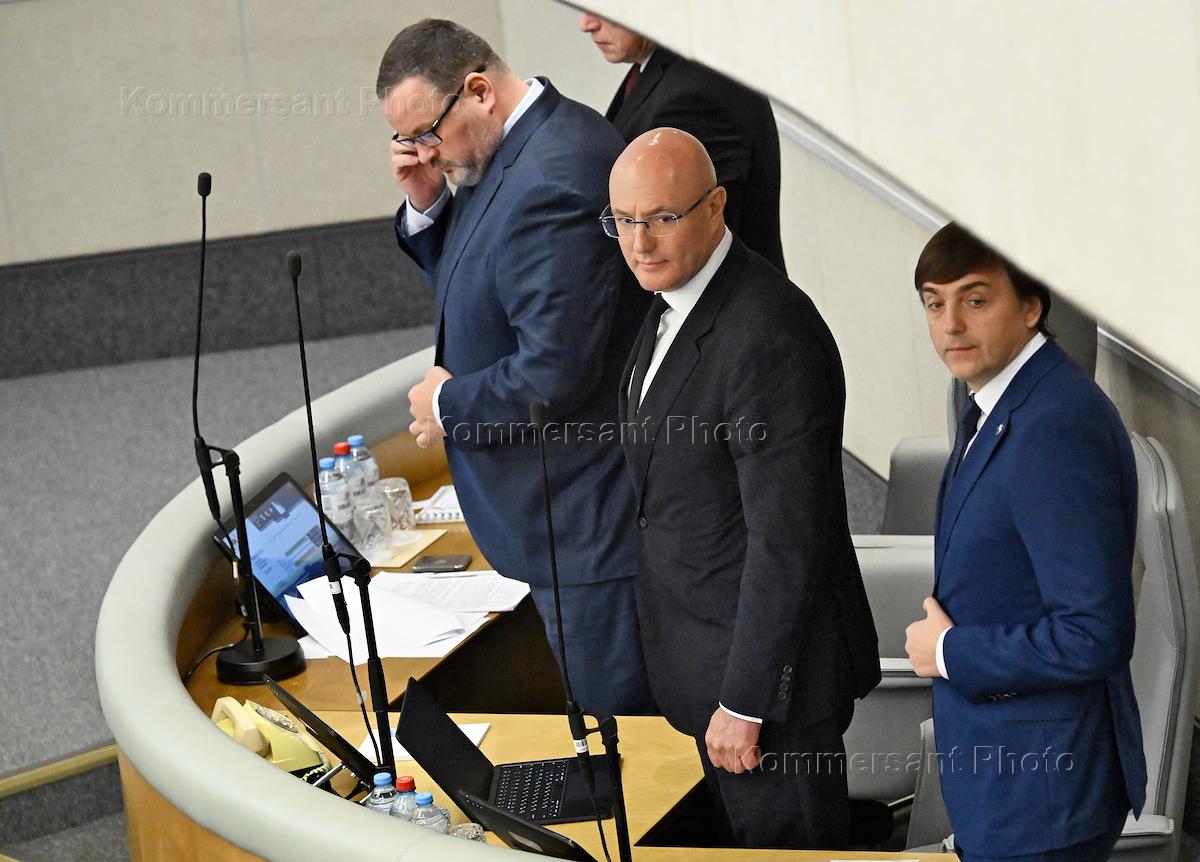 Пленарное заседание Государственной думы (ГД) России. Слева направо: заместитель председателя правительства России Дмитрий Чернышенко, министр здравоохранения России Михаил Мурашко и министр труда и социальной защиты России Антон Котяков во время заседания.