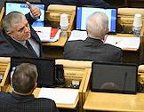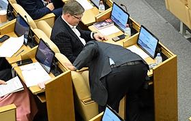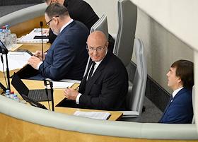 Пленарное заседание Государственной думы (ГД) России. Член комитета ГД России по транспорту и развитию транспортной инфраструктуры Ринат Аюпов (в центре) во время заседания.