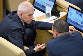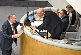 Пленарное заседание Государственной думы (ГД) России. Председатель комитета ГД России по физической культуре и спорту Олег Матыцин (слева) и член ГД России по безопасности и противодействию коррупции Динар Гильмутдинов (справа) во время заседания.