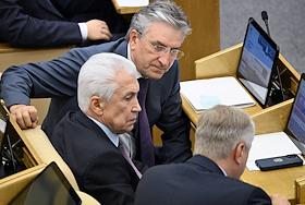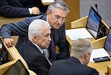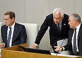 Пленарное заседание Государственной думы (ГД) России. Слева направо: руководитель фракции "Единая Россия" в ГД России Владимир Васильев, член комитета ГД России по бюджету и налогам Айрат Фаррахов и член комитета ГД России по государственному строительству и законодательству Дмитрий Вяткин во время заседания.