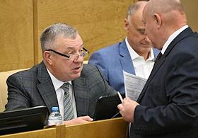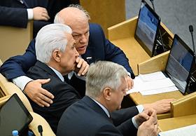 Пленарное заседание Государственной думы (ГД) России. Слева направо: первый заместитель председателя комитета ГД по труду, социальной политике и делам ветеранов Николай Коломейцев, председатель комитета ГД России по аграрным вопросам Владимир Кашин и член комитета ГД России по охране здоровья Николай Осадчий во время заседания.