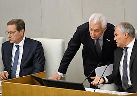 Пленарное заседание Государственной думы (ГД) России. Слева направо: руководитель фракции "Единая Россия" в ГД России Владимир Васильев, заместитель председателя комитета ГД России по экологии и охране окружающей среды Анатолий Грешневиков и член комитета ГД России по государственному строительству и законодательству Дмитрий Вяткин во время заседания.