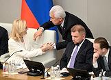 Пленарное заседание Государственной думы (ГД) России. Справа налево: первый заместитель председателя комитета ГД России по просвещению Яна Лантратова, аудитор Счетной палаты России Дмитрий Зайцев и председатель комитета ГД России по науке и высшему образованию Сергей Кабышев во время заседания.