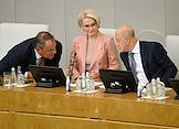 Пленарное заседание Государственной думы (ГД) России. Слева направо: заместители председателя ГД России Петр Толстой, Виктория Абрамченко и Александр Бабаков во время заседания.