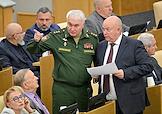 Пленарное заседание Государственной думы (ГД) России. Член комитета ГД России по обороне Андрей Гурулев (слева) и первый заместитель председателя комитета ГД по обороне Андрей Красов (справа) во время заседания.
