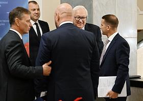Пленарное заседание Государственной думы (ГД) России. Заместитель министра иностранных дел России Сергей Рябков (второй справа), Председатель комитета ГД по труду, социальной политике и делам ветеранов Ярослав Нилов (справа) и заместитель председателя комитета по информационной политике, информационным технологиям и связи Евгений Попов (второй слева) во время пресс-подхода перед началом заседания.
